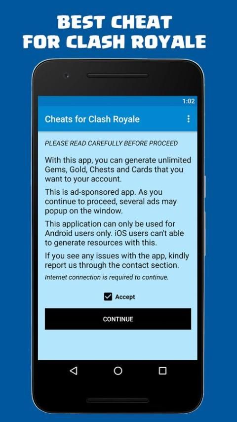 Это приложение не хак для Clash Royale. Его единственная шалость, и это не дает драгоценные камни или ресурсы на ваш счет кр.