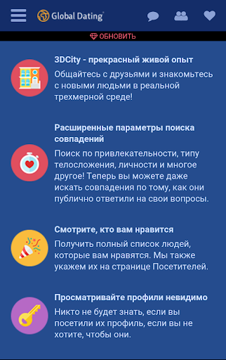 Супер-преимущества - это услуга подписки: чат с участниками через чат, видеочат, аудиочат через мобильный телефон или микрофон на вашем компьютере, 3D-игры - играйте в игры с другими участниками, 3DCity - переходите из комнаты в комнату и общайтесь с онлайн-участниками, Street Chat - 2 участники могут встречаться и общаться на случайной улице в вашем городе или городе-члене, и у нас также есть другие супер преимущества. Global Dating включает в себя функции отчетности и блокировки, которые помогут вам защитить себя от нежелательных участников, таких как мошенники или другое поведение. Сообщите администрации, чтобы мы могли удалить нежелательного участника с сайта. Если участник не вошел в систему, будут автоматически отправлены электронные письма, информирующие вас о том, что вы связались с ним или с ней.