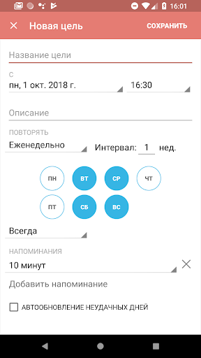 Ежедневное автоматическое резервное копирование на локальное хранилище Используйте календарь, чтобы выбрать любой день на прошлой неделе и при необходимости восстановить привычки / цели.
