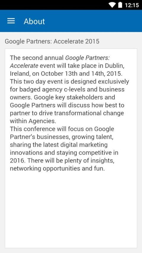 This App will guide you through your experience at Google Partners Accelerate 2015. Here you will find updates, speaker information, your schedule, maps and twitter feed. You can also network with fellow attendees who have the app. This event is an invite only event for Badged members of the Google Partners program.