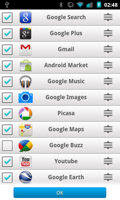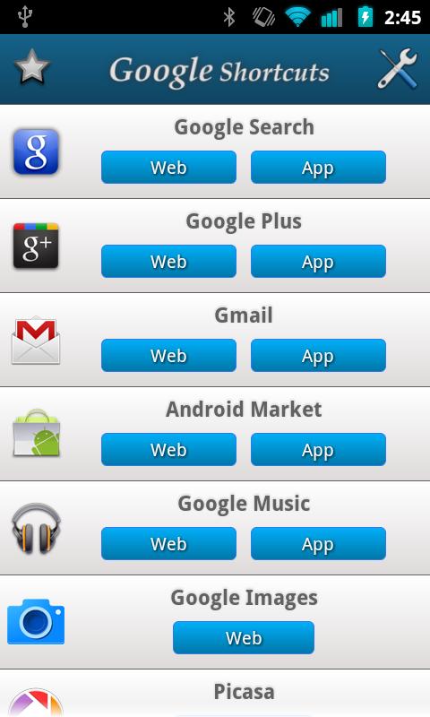 Free app !Shortcuts to google services.Google+, Google Search, Gmail, Google Images, Google Map, Android Market, Google AdmobVery useful for developers !The list would also be intensified in future updatesVersion 1 0.1: Add Google Book, Google Music, Youtube, Google Docs, Google Analytics, Blogger, Google Translate, Google Reader, Google Buzz1.2: Optimisation for small, normal(ex: HTC Wildfire), large(ex samsung Galaxy S 1 and 2 and extra large(tablet) screen.The next update will include the ability to sort, view, hiding items in the listRecent changes:1.2: Optimisation for small, normal(ex: HTC Wildfire), large(ex Samsung Galaxy S 1 and 2) and extra large(tablet) screen.The next update will include the ability to sort, view, hiding items in the listContent rating: Everyone
