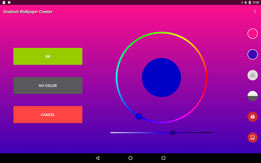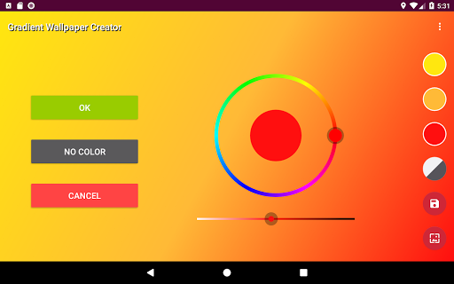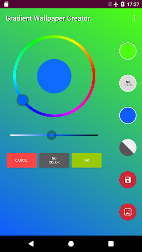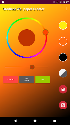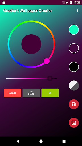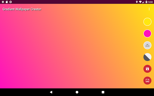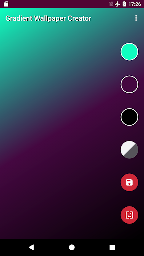 Gradient Wallpaper Creator позволит вам создать потрясающие обои для вашего телефона и планшета.Это очень интуитивно понятно и легко в использовании.Просто выберите любимые цвета и ориентацию (горизонтальные, вертикальные, диагональные ...) и приложение автоматически создаст градиент на вашем экране.Вы можете сохранить его, установить как обои или изменить его.