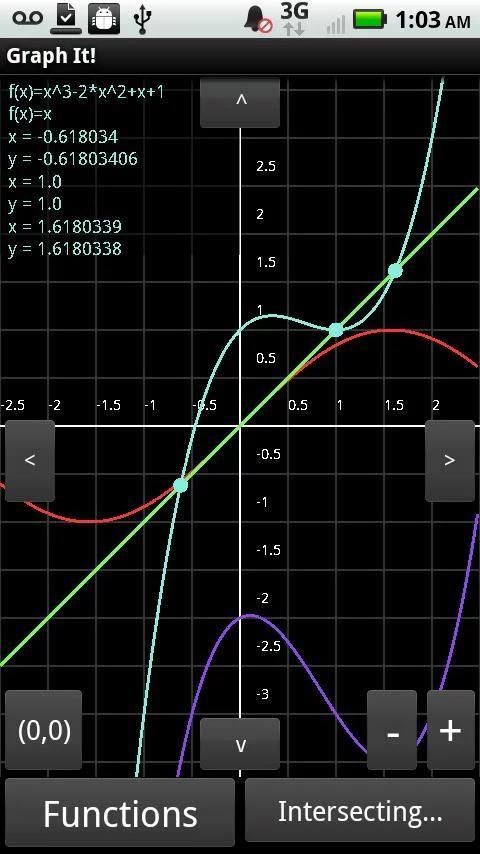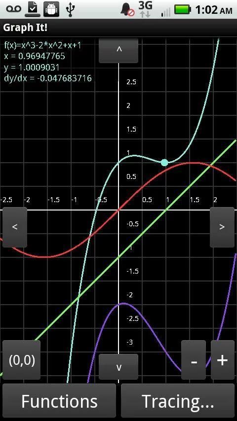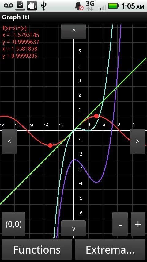 Essential graphing calculator functions: tracing, dy/dx, roots, extrema (max/mins) and intersections, all controlled by multi-touch! (See video for