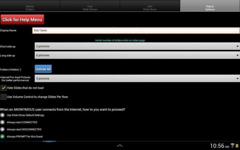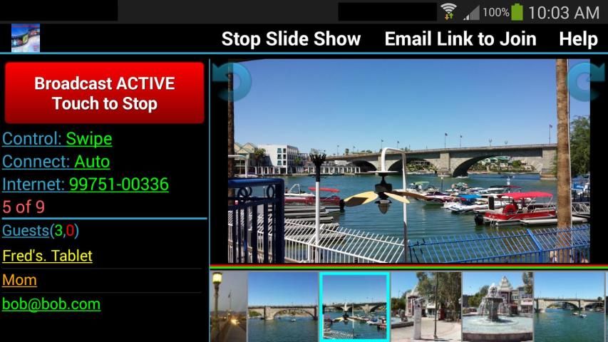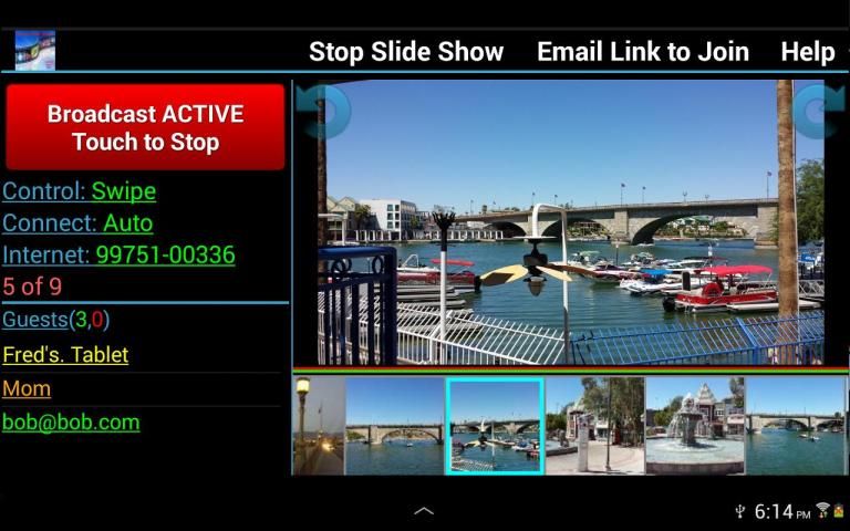 Доступ к www.GroupSlideShow.com является бесплатным, поэтому, даже если ваши друзья или семья не имеют Android устройства, они все еще могут быть, гость в вашем слайд-шоу! Мы позволяем Гости подключить через Интернет анонимно (но это зависит от вас, если вы позволите им просматривать ваши фотографии), но мы делаем поощрять гость создать бесплатную учетную запись. Создание учетной записи с действительным электронной почте позволяет нам проверить, что письмо так, что когда гость подключается к слайд-шоу на сайте, вы будете знать, кто это (их электронной почты будет показано, как их идентификатора). Гости соединительные анонимно отображаются по-разному и могут относиться по-разному в зависимости от ваших настроек на странице настроек.