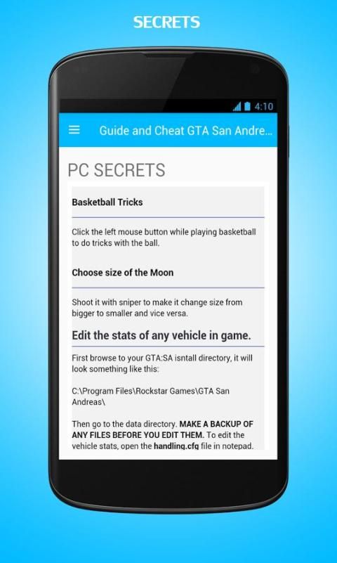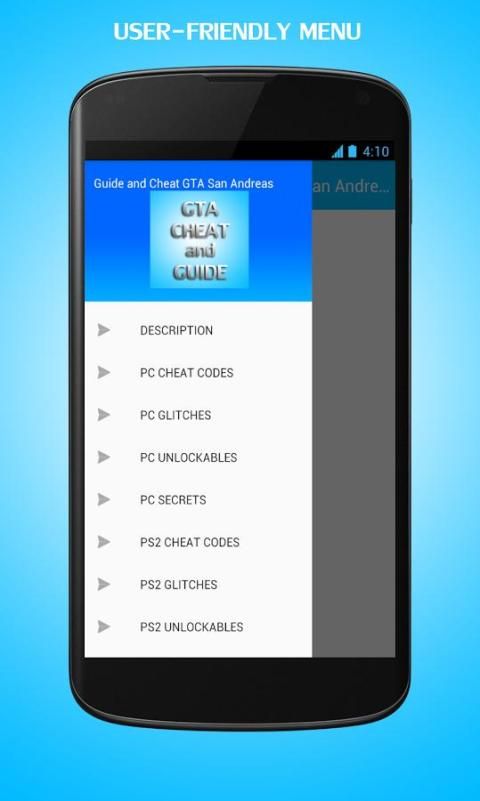 Руководство и прохождение для GTA San Andreas является неофициальным руководство по применению, прохождение игры, информация, стратегии, советы и хитрости, читы, секреты, взломы, и все для GTA San Andreas геймеров! Это приложение содержит очень огромные коллекции информации для GTA San Andreas, таких как руководство миссии, достижение руководства, пасхальные яйца гид, глюки гид и многое другое. Скачать хитрить и руководство для GTA San Andreas и стать лучшим игроком игры GTA San Andreas!