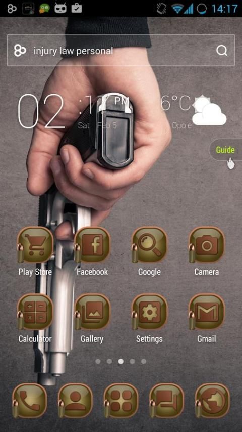 Пистолет оружие Тема разработана специально для любителей шутер от первого лица игры. Если вы хотели бы использовать оружие в виртуальном мире вы будете любить этот прохладный пусковой кожу. Что вы получите или пусковая тема? Четыре удивительные обои с оружием. Каждый из пушек имеют серебряную или хромированную цвет ствола. Это будет выглядеть удивительным на главном экране. Специально для Вас мы разработали более 40 пользовательских иконок в военной камуфляжной кожи с пулей в углу.