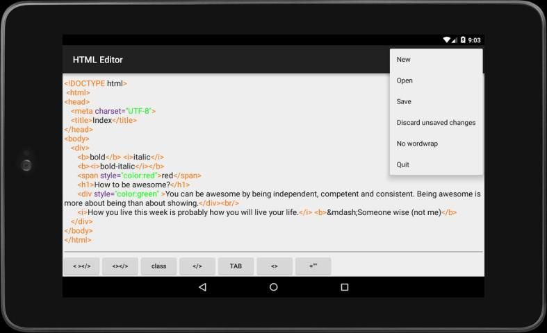 Это приложение включает в себя менеджер файлов, HTML редактор и просмотра HTML-страниц. Улучшение вашего HTML, JavaScript и CSS навыки. Вы даже можете использовать его для редактирования простых XML.