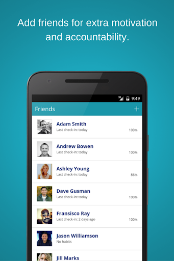 Избранные друзья могут видеть ваш прогресс и помочь вам остаться мотивированным.Надеюсь, они разделяют некоторые привычки с вами.В присуждении вы можете отправить своих друзей потрясающие GIFS, как высокий пятерку или грудь, чтобы помочь им оставаться мотивированным.Трекер привычка никогда не был веселее!Мы помогаем партнерам по подотчетности оставаться в связи с этим.> • Гибкие привычки графики