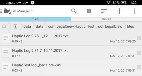 Приложение делает сохранить датируемые лог-файл для каждого сеанса, который сохраняет подробную информацию о каждом тактильных вы проверяете, и когда непрерывный эффект прекращается.