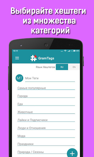В приложении имеется возможность быстрой смены языка хэштегов с русского на английский. Вы также можете использовать теги для размещения в других популярных социальных сетях.