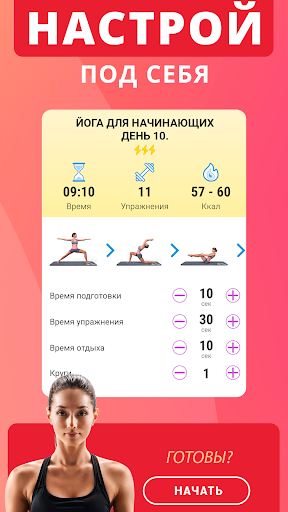 ✓ Вы можете самостоятельно создавать свои тренировки и программы, используя готовые асаны йоги для гибкости на русском, устанавливать их продолжительность, настраивать сложность и время отдыха;