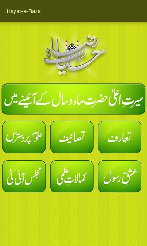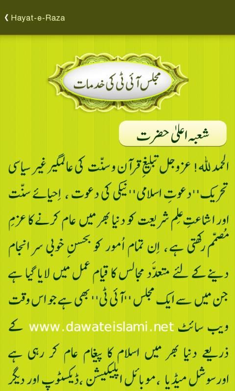 Меджлис-э-информационных технологий Dawat-э-Ислами, глобальной неполитические движения за распространение Священного Корана и Сунны, ввел много приложений, чтобы служить мусульманской уммы. "Хаят-э-Раза" приложение предоставляет краткую биографию Ала Хазрат, Имам-э-Ахль-э-сунны, Имам Ахмад Раза Ханом رحمۃ اللہ تعالی علیہ.