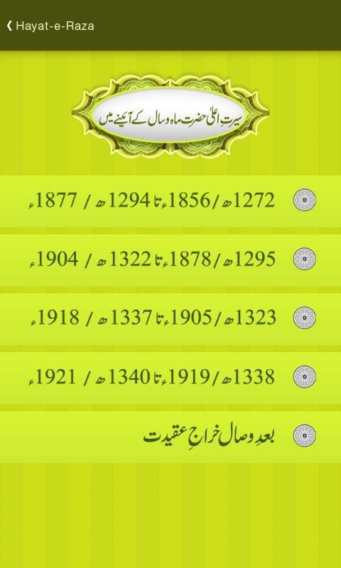 Приложение основано на аудио и видео файлов, содержащих биографию имама Ахмеда Раза رحمۃ اللہ تعالی علیہ