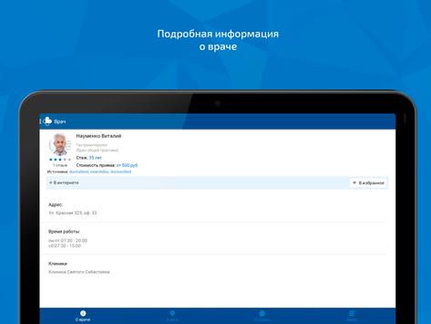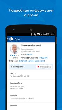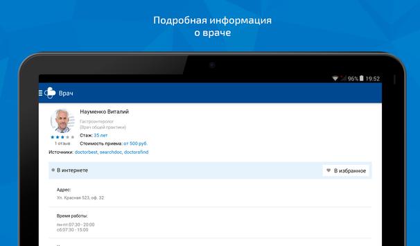 - подробная информация о враче: специальность, квалификация, место работы, часы приёма и его стоимость, статьи и публикации;