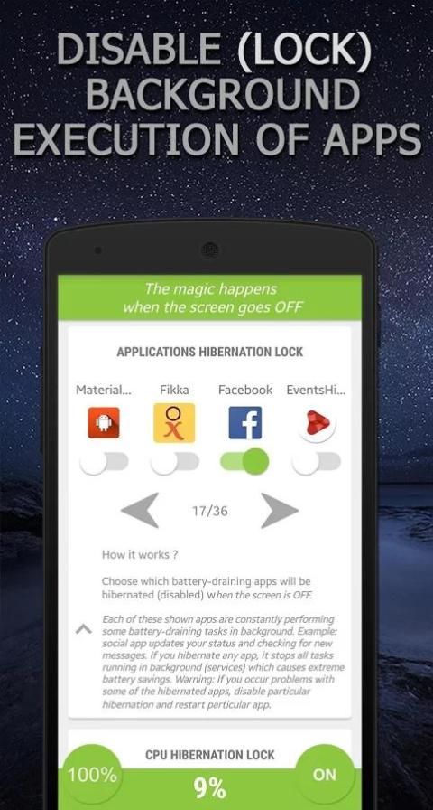 Hibernate Мои приложения Запрещает энергоемких приложений в фоновом режиме. Она полностью останавливает фоновое выполнение приложений, когда экран телефона выключен. Приложения, не будет выполняться в фоновом режиме, когда телефон находится в режиме ожидания.