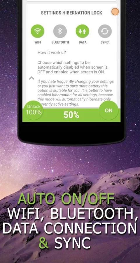 Hibernating Настройки, как Wi-Fi, подключение данных, Bluetooth и синхронизация делает это приложение еще более полезным и удобно. Его так же, как при выключении экрана устройства WIFI автоматически выключается и при включении на экране WiFi автоматически включается и начать подключение к доступной сети Wi-Fi. То же дело происходит с подключения к данным, а также. Так что вам не нужно вручную ON / OFF эти параметры, так как это может быть сделано автоматически с помощью этого приложения.