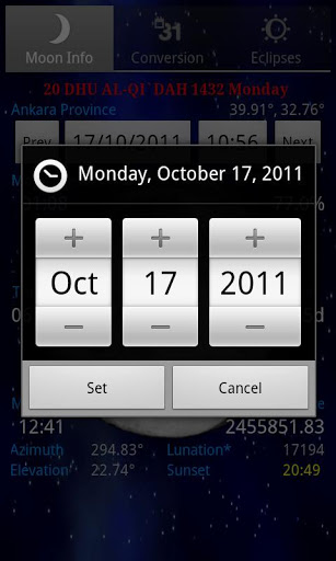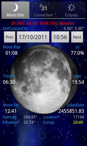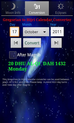 Gregorian to hijri dates. Islamic calendar Hegira HijrahHicri TakvimConversion toolfrom Gregorian Calendar dates to the hijri dates with a nice widget application. It calculates hijri calendar according to the global moon sighting conference criteria. Moon Earth Elongation angle is defined as 8 degrees.Widget application warns before Islamic holidays such as lailatul qadr, baraat; it also displays eid days. Hegira Hicri Takvim Taqwim.Ultimate Conversion tool from Gregorian Calendar dates to the hijri dates with a nice widget application.It covers the years 4712 B.C and until 2149. Even though you can search the dates before the hijrah event and historic ages. Display data based on your NetworkGPS location Comprehensive moon information and includes specific moonrise, moon transit and moonset . Moonrise and moonset times for your location. Percent of the illuminated moon area. Moon Parameters Precise moon phases times. Current moons age: how far along the moon is in its full cycle. Moon elevation, azimuthnavigation capability between the day and time precision.Upcoming with the Next Release Central or Partial, Solar and Lunar Eclipses included Zodiac sign the Moon is in.Exact Timings ofWaxing Crescent, First Quarter, Waxing Gibbous, Full Moon, Waning Gibbous, Last Quarter, Waning Crescent, New Moon and conjunction. Moon distance to the Earth. Ecliptic solar and lunar longitude and latitude values. Sunrise, sunset and zenith times. Astrology and astronomy Display data based on your NetworkGPS location Comprehensive moon information and includes specific moonrise, moon transit and moonset . Moonrise and moonset times for your location. Percent of the illuminated moon area. Moon Parameters Precise moon phases times. Current moons age: how far along the moon is in its full cycle. Moon elevation, azimuth Navigation capability between the day and time precision. hijri hijra hijrah hijriah hijriya hijriyah AH hidra Islamilainen Hijras Iszlm Hidras Hidros Hidra islamski Hicri