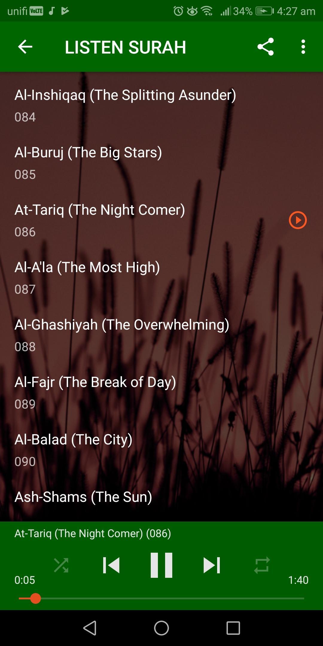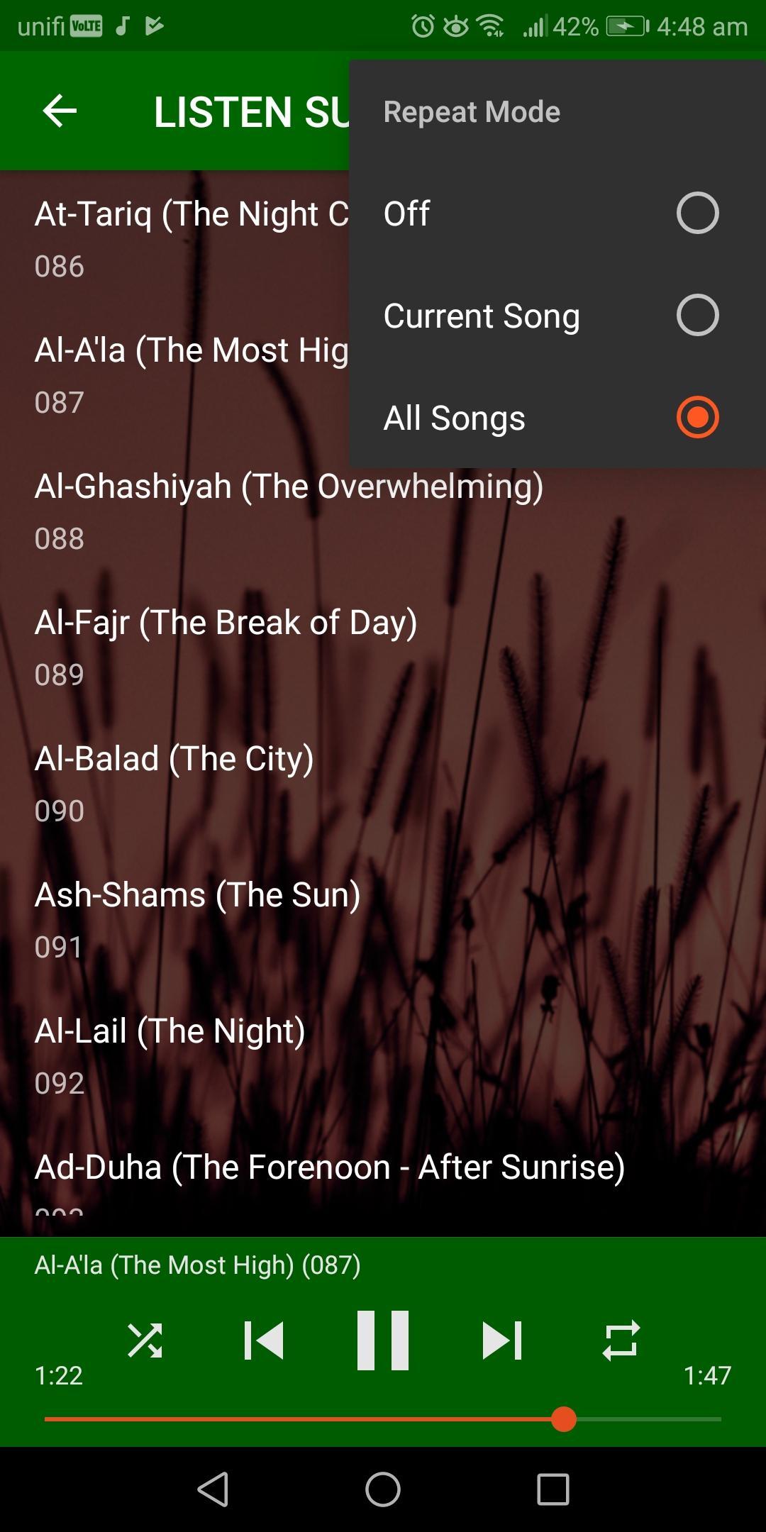 Mishary Rasyid Al-Afasy offers you full surah audio playback. You can play all surah or repeat only one surah as you like.
