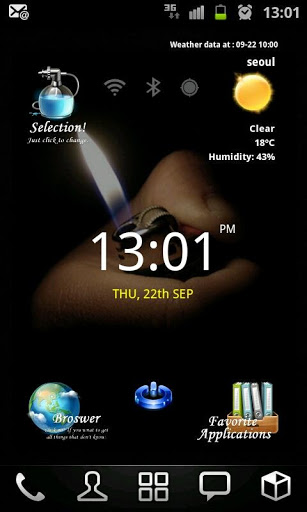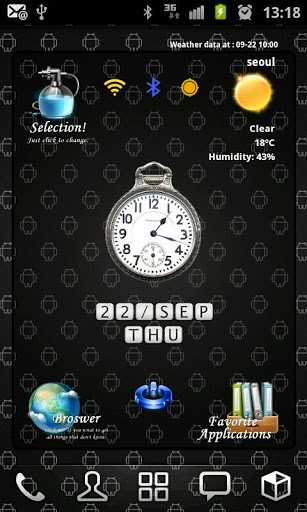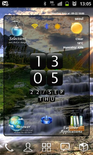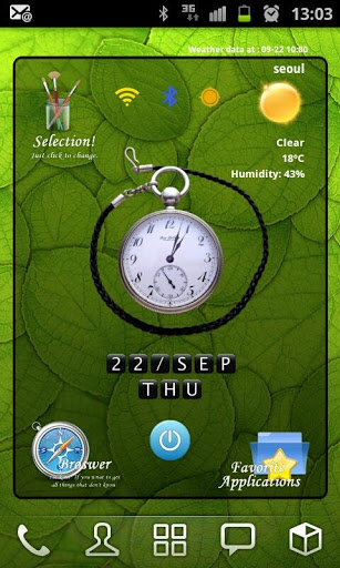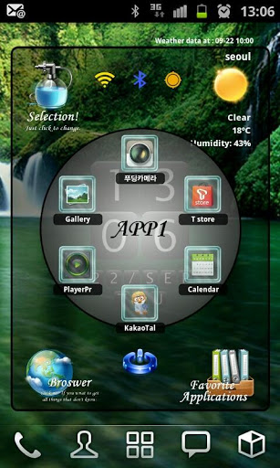 Here is new style home widget launcher Selection.Load just 1 widget at your home screen, you can get beautifuldigital clock, google weather, network status, soft screenoffand small launcher.Each itemclock,favorite launcher and main links have 3 themesand easy to change on setting screen.Features: Include 4x4 size only. Digital Clock 3 colors Analog Clock 2 style Digital Text Clock Color changeable Main links browser Theme Setting, Weather and Favorite toggle.3 style theme include Simple goole weather3 days fore cast Small 12 favorite application launcher, you can change the links to other program. 3 style icon skins include Soft screenoff Network status indicators.Each icons link to setting programs Landscape screen included Support English and Korean language.Add widget:1Remove all widget and links on 1 page of your home.2Hole on your homescreen3Select quot;Widgetsquot;4Find quot;SFHome Widget Selection04quot;5Click on it6The widget will appear in your homescreenNote Home screen grid must 4x4 or large. In case 4x5, 5x5 size, you can expand the widget.Button Actions:1. LeftTop Selection: Run widget setting program2. LeftBottom Browser: Run Browser3. RightBottom Favorite : Toggle favorite view4. RightTop Weather Icon : Toggle forecast viewText of Weather Condition : Weather update manually5. Center Clock : Run ClockAlarm program6. CenterBottom Power : Run softScreenoff7. CenterTop Wifi : Run setting Wifi8. CenterTop bluetooth : Run setting Bluetooth9. CenterTop GPS : Run setting GPS10. Center of Application view : Toggle App1App2Setting:1. Change Theme Click selection icon on topleft side. Select main icon style Select clock color Select favorite icon style2. Weather Setting Click selection icon on topleft side. Click search Location Enter city name and click quot;Findquot; button. If the laocation found, then click quot;Savequot; button Select update period Select temperature unit3. Change favorite links Click selection icon on topleft side. Click Change application links Select icons that you want to change Select application that you want to use Icon and name is changed to your selection.program icons used. you can39;t change custom icons Back to the home screen Note Main links can change link only.You can39;t use program icons for them. Note: Please exclude the widget from any task killers. Weather update is needed maualy when reboot phonejust one time ScreenOff and On requred to refresh screen when home grid size changejust one time When widget first loading, program find the programs on the phone for favorite. If there is no programs, it appear quot;No Appquot;.You can change new program that you have.