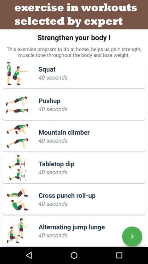 Все ежедневный план тренировок в этом приложении увеличивает шаг интенсивности упражнений за шагом. Вам даже не нужно выходить из дома, не нужно идти в спортзал, просто использовать свой вес тела и занять несколько минут на day.There много тренировок подпрограмм вы можете сделать в этом приложении, особенно абс тренировки в получить шесть пакетов для мужчин и приклада, сексуальных ног для женщин.