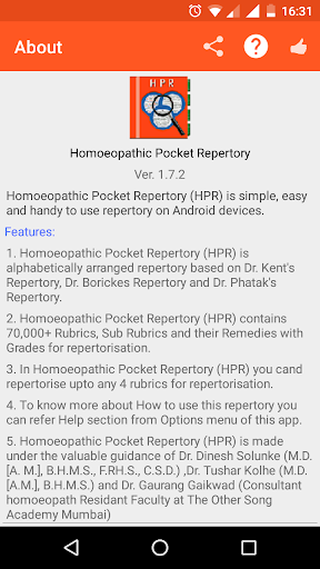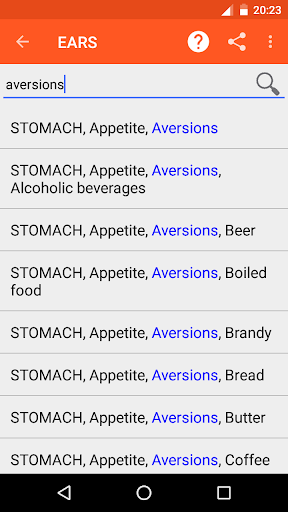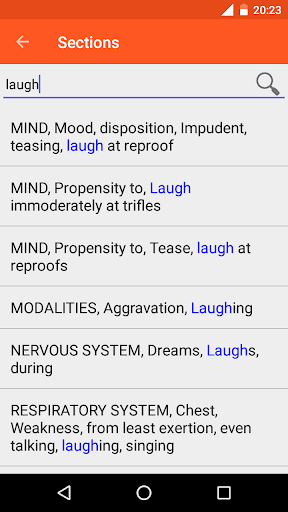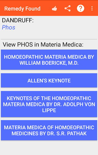 Теперь вы можете получить доступ к Materia Medica непосредственно во время реперторизации, просто нажмите кнопку. После выбора лекарства от найденного списка лекарств, вы увидите опцию (ы), чтобы просмотреть, что исправления в Materica Medica она существует. Просто выберите (нажмите) Materia Medica соответствующих авторе для просмотра.