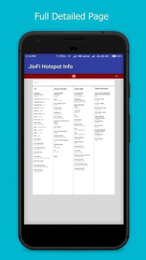«Менеджер Hotspot для Jiofi» отображает детальную информацию в том числе процентных батарей и список пользователей, подключенных к JioFi Hotspot. Пользователи могут также изменить пароль и имя сети SSID легко с одним нажатием кнопки. Существует также возможность заблокировать любого пользователя от подключения к точке доступа. Постоянное уведомление также отображается в строке состояния, которая указывает на батарею и пользователей, подключенных.