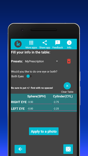 Вы когда-нибудь задавались вопросом, как на самом деле видят люди с очками?Ну, IC - это приложение, которое вы хотите!Просто добавьте номер очков, добавьте фото и увидимся в мире, как они его видят!