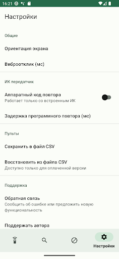 С помощью этого приложения вы можете попытаться подобрать ИК коды для вашего устройства, сохранить найденные коды в виде пульта управления.