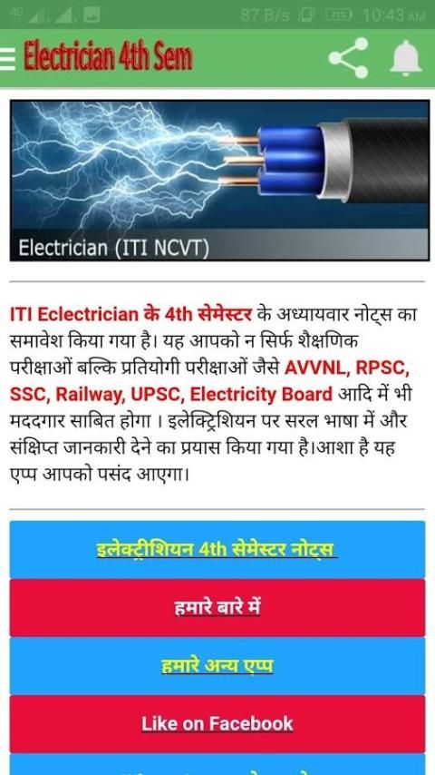 ITI были включены Adyaywar отмечает четвёртом семестре Eclectrician. Это не только академические экзамены, а конкурсные экзамены будут также оказаться полезными в такой AVVNL, RPSC, SSC, железная дороге, UPSC, электроэнергия и т.д. совет. Говоря простым языком, электрика, и попытался кратко надежды это приложение, вам понравится.
