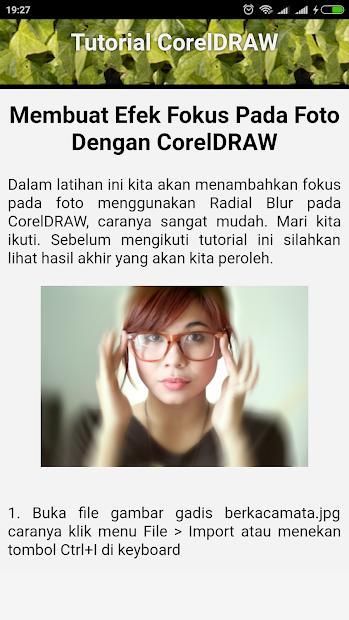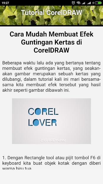 Aplikasi ini berisi kumpulan tutorial CorelDRAW untuk menyelesaikan berbagai proyek atau tugas design grafis yang sering dibuat untuk keperluan sehari hari. Materi tutorial CorelDRAW ini sangat lengkap dan full offline jadi bisa dipergunakan sebagai buku saku panduan bagi pemula dan profesional. Materi tutorial CorelDRAW ini akan terus diupdate dengan desain-desain yang mengikuti perkembangan jaman.