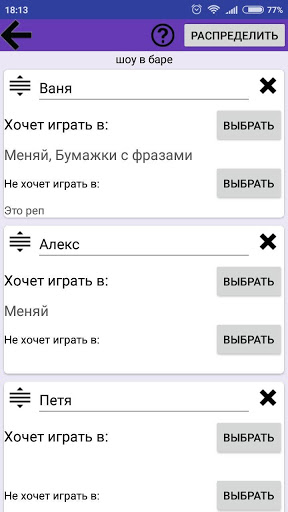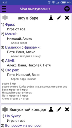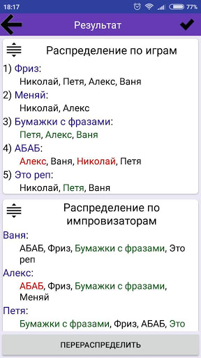 Раздел для планирования будущего выступления, позволяющий с учётом предпочтений оптимально распределить импровизаторов по играм.