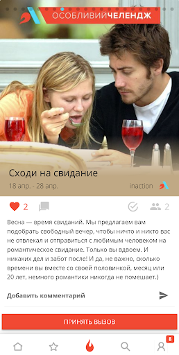InAction – это простой способ выйти из зоны комфорта, разнообразить свою жизнь, мотивировать себя на действия, чтобы самосовершенствоваться каждый день. Станьте на путь постоянного развития вместе с людьми, которые вас вдохновляют.