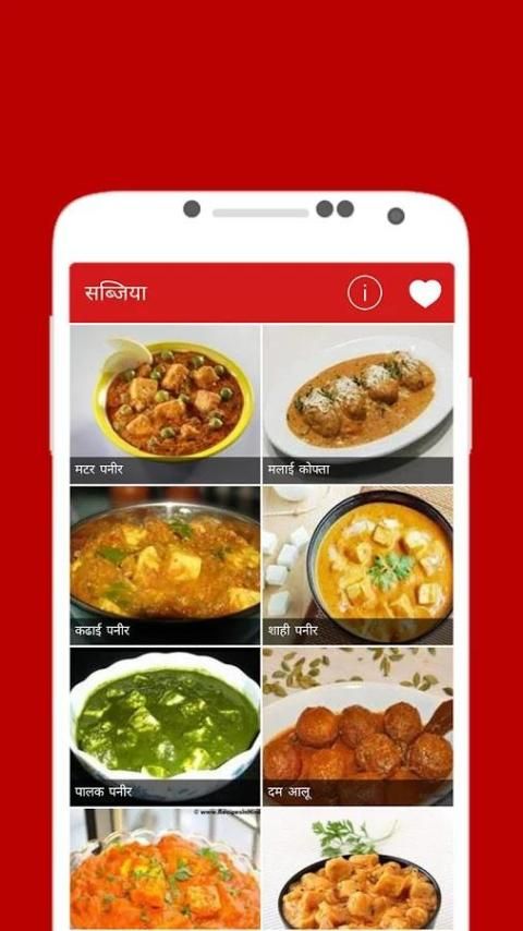 Также включает в себя северные индийские рецепты, южноиндийскую рецепты, бенгальские рецепты, Maharashtrian рецептов. Индийские Рецепты которые включают пускатели, основное блюдо, десерты, закуски, сладости на хинди
