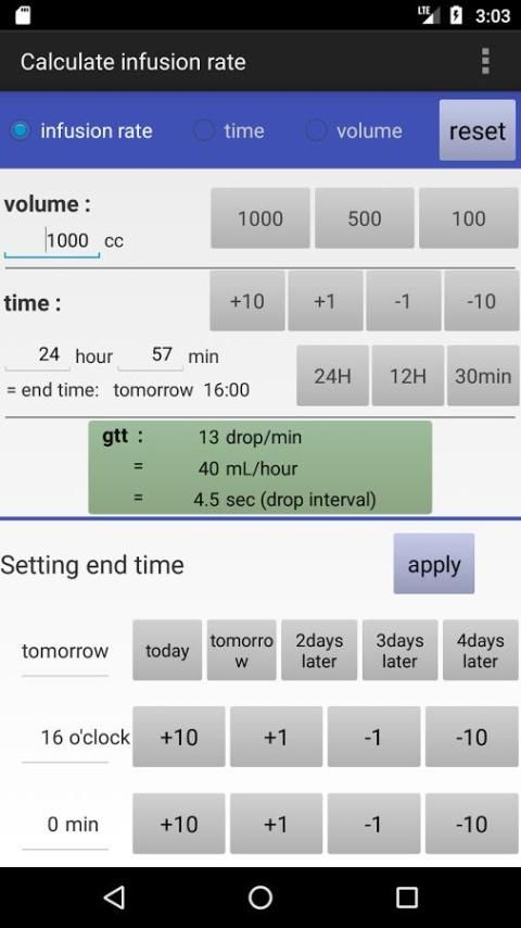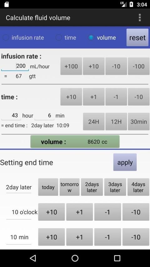 And this app calculate the total volume of fluid or the time needed to administer fluid.