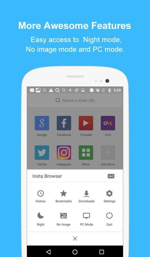 Insta браузер представляет собой отличный, простой, безопасный высокоскоростной мобильный браузер, с простыми функциями, которые удобно использовать для того, чтобы более простое управление часто используемых и любимых URL. Его чрезвычайно малый размер позволяет за меньшее потребление памяти, а также более плавной скоростью Интернета, и его мощная функция объявления фильтр может сделать опыт просмотра более удобным. Есть также много других полезных функций ждут Вас, чтобы исследовать. Чистейшая мобильный Интернет на Insta Browser, новенькой избранника пользователей во всем мире мобильный браузер.