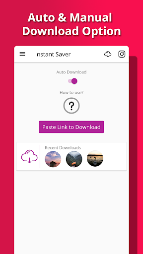 * Автоматическая загрузка Вкл. / Выкл. - консервативный дизайн Instant Saver - быстрый и быстрый способ использовать приложение только при необходимости. Позволяет вам полностью контролировать загрузку изображений и видео.
