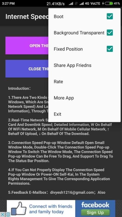 -Есть Два вида скорости подключения всплывающих окон, которые маленькое окно (Дисплей в режиме реального времени Скорость сети) и большой всплывающее окно (Показать подробную информацию), через приложение управления и выключается.
