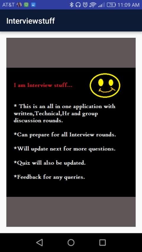 Вот введение приложения с интервью вопросов и ответами различных раундов, чтобы столкнуться в интервью, как написано, технический, Hr, группа discussion.It также охватывает Aptitude, словесные способности и логические вопросы рассуждения в письменном разделе, а также способность охватывает многие темы, как проблемы и формула для поезда проблемы, Хайтс и расстояния, простые проценты и так далее.