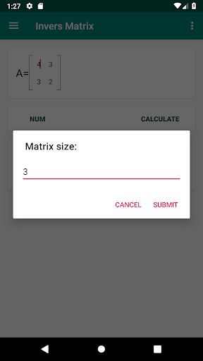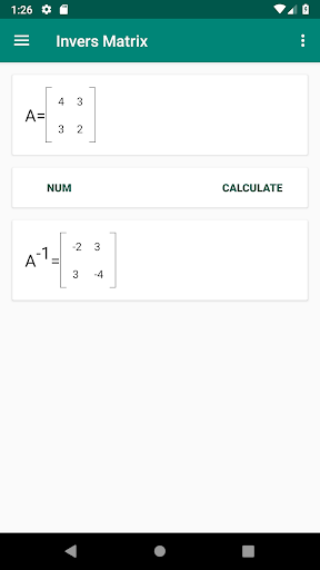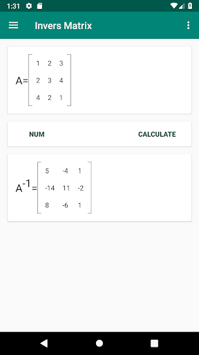 Invers Matrix is one of math calculator app. This app help user to calculate the inverse of square matrix with Gauss-Jordan elimination. With single click, the inverse result will be available in bottom of matrix.