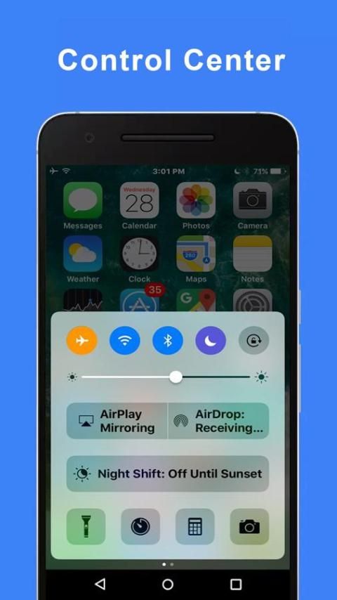- Быстрое управление для поворота WiFi вкл / выкл, изменение яркости, увеличения / уменьшения, поворот Bluetooth On / Off, открытой установки с экрана блокировки сигнализации.