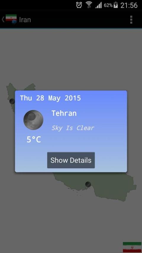 Иран Погода поставляется с элегантной и интуитивно понятный пользовательский интерфейс, который отображает текущие данные о погоде, как температура или текущих условий, а также прогнозов с графиками для высокой и максимальной температуры.