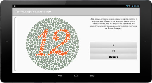 * Демонстрационная пластина (пластина номер один, обычно цифра 12); разработана так, что бы форма была видима как лицами с нормальным зрением, так и лицами с дефектами восприятия цвета. Обычно служит только для демонстрационных целей и не учитывается для целей проверки.