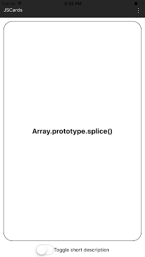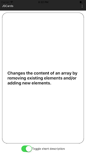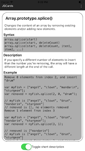 The front of the card toggles between method name and short description, while the back of the card contains the complete API documentation for the method, including syntax and examples.