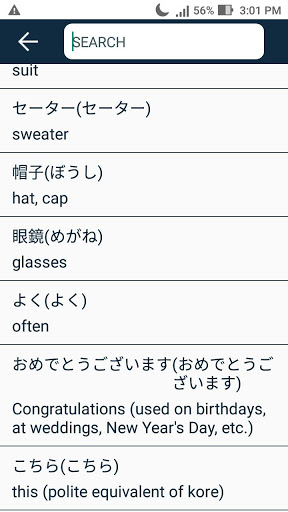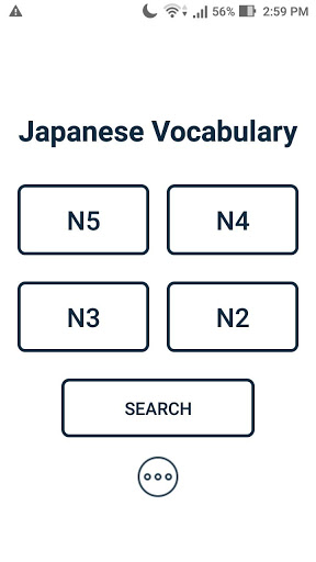Это приложение содержит японский словарный запас для всех уровней (JLPT N5, JLPT N4, JLPT N3 и JLPT N2).