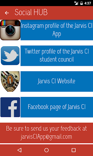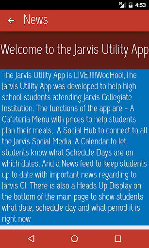 a Social Hub to connect to all the Jarvis Social Media, a Calendar to let students know what Schedule Days are on which dates, and a News feed to keep students up to date with important announcements pertaining to Jarvis Collegiate Institute. There is also a Heads Up Display at the bottom of the main page to show students today's date, schedule for the day and real time display as to what period it is.