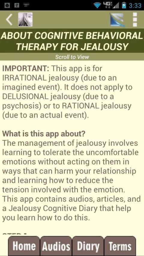 Если вы ответили "да" на любой из этих вопросов, это приложение использует методы когнитивно-поведенческой терапии (КПТ), чтобы научить вас, как обратиться к иррациональную ревность, что мешает вашим отношениям.
