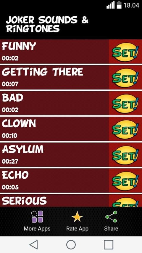 Если вы ищете наиболее популярных мелодий вы пришли в нужное место. Здесь у нас есть много различных звуков смеха, а некоторые из них забавные звуки, и некоторые из них сумасшедшие звуки, но все они могут быть вашими, если вы скачать эти бесплатные мелодии для Android. Joker Звуки и мелодии показывает коллекцию супер смешные мелодии и звуки смеха, и как только вы установите эти мелодии бесплатно вы стали настоящим комиком в вашей группе, как настоящий джокер.