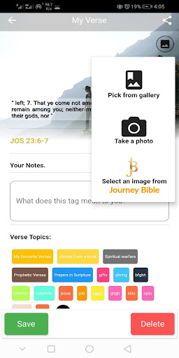 Приложение бесплатно, но у него есть возможность пожертвовать для доступа для добавления неограниченных тегов стихов. Деньги от пожертвований идут на техническое обслуживание приложений, и что остается в печатной бумаге Библии для распространения через наших благотворительных партнеров. Личный путь, который Бог приводит вас через Писание. Макет и формат позволяют вам запечатлеть эти темы, мысли, молитвы и откровения, которые являются личными для вас и ваших отношений с Богом. Ваш опыт. Тег, когда вы выберете текст, функциональность тега стиха появится для вас, чтобы добавить свой выбор в ваши темы и добавить заметки и даже изображение, личное в стихе. > Чтобы вы начали, вот некоторые примеры тем, которые вы можете рассмотреть: