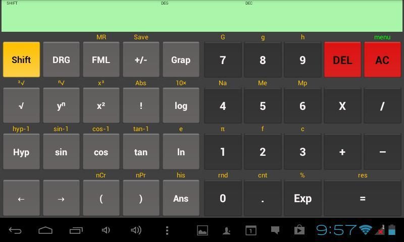 Это очень полный научный калькулятор, содержит большинство математических функций с возможностью выполнения графических функций. Она включает в себя библиотеку из ста (100) формул математики и физики готов к использованию, который генерирует результат после ввода значения переменных, а также позволяет легко расширить библиотеку с вашими собственными формул или функций, в общем очень простой в использовании, как реальный калькулятор, включает в себя дисплей для записи операций без ограничения символов, позволяет использовать круглые скобки и уважает иерархию выражений, результат отображается на второй строке дисплея с возможностью обновлять или исправлять любой символ если есть ошибка в выражении.