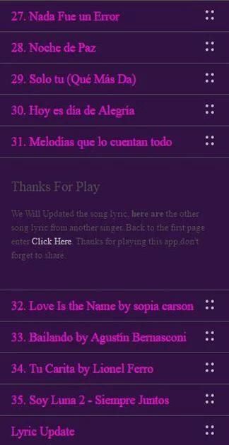 Прослушать все песни Karol Sevilla и я теленовелла Луна-2 во время чтения письма в этом приложении. Если они большие поклонники Luna 2 теленовелле Я абсолютно действительно люблю это приложение. Будь благословен, как вам нравится, учиться и петь вместе с этим приложением.
